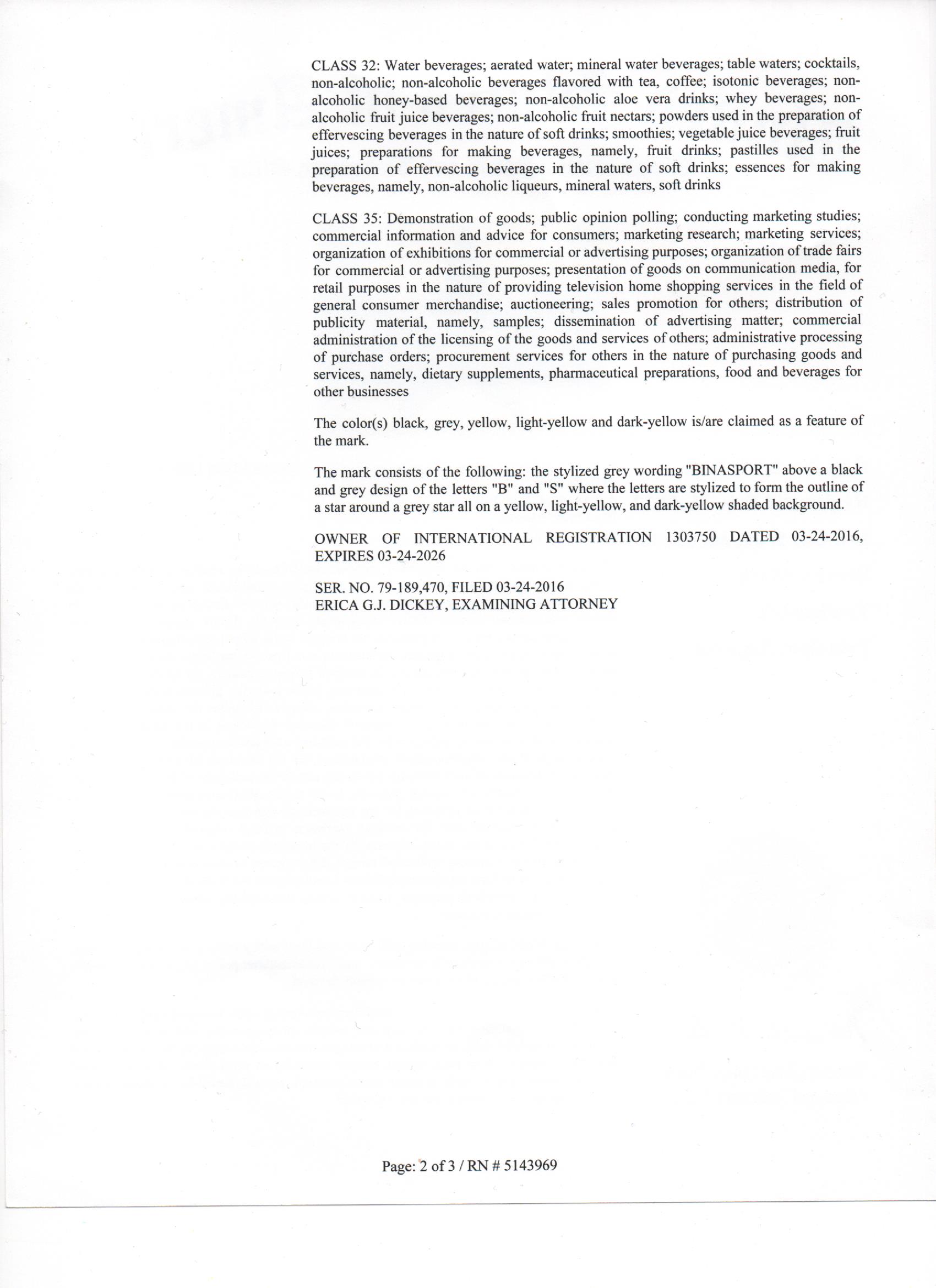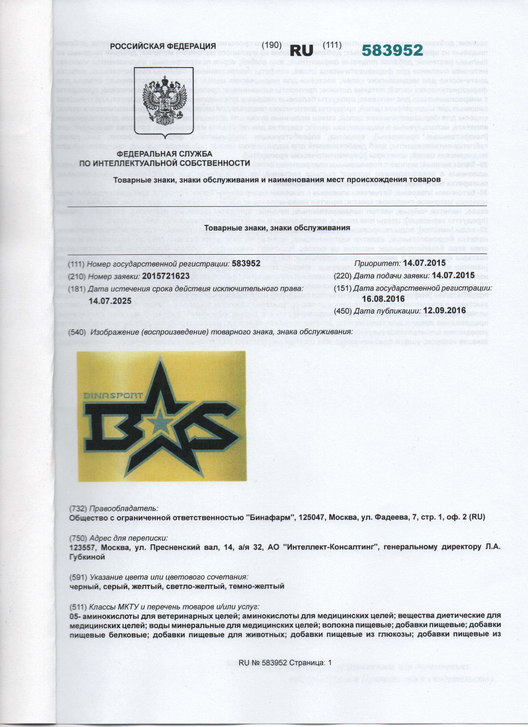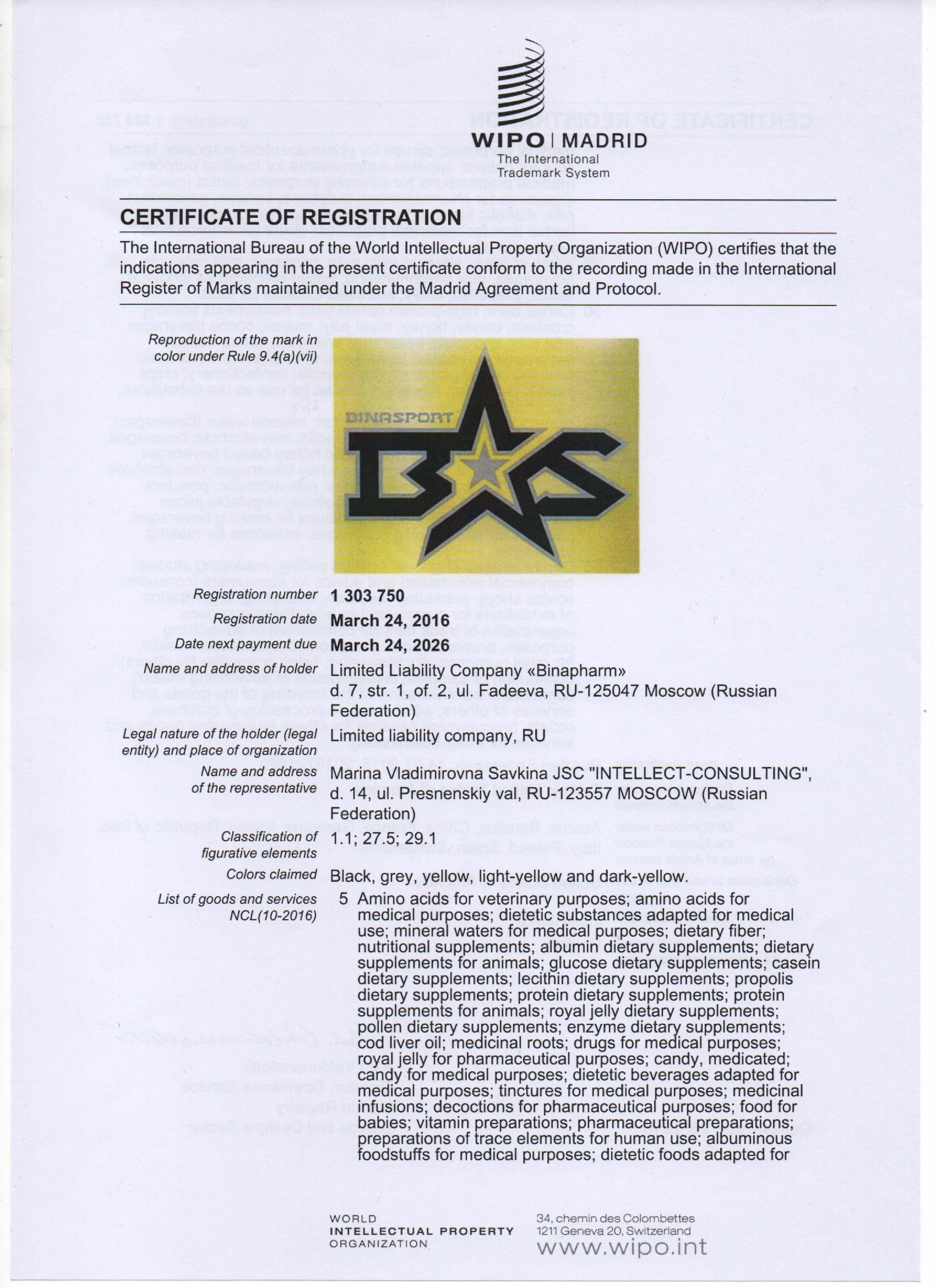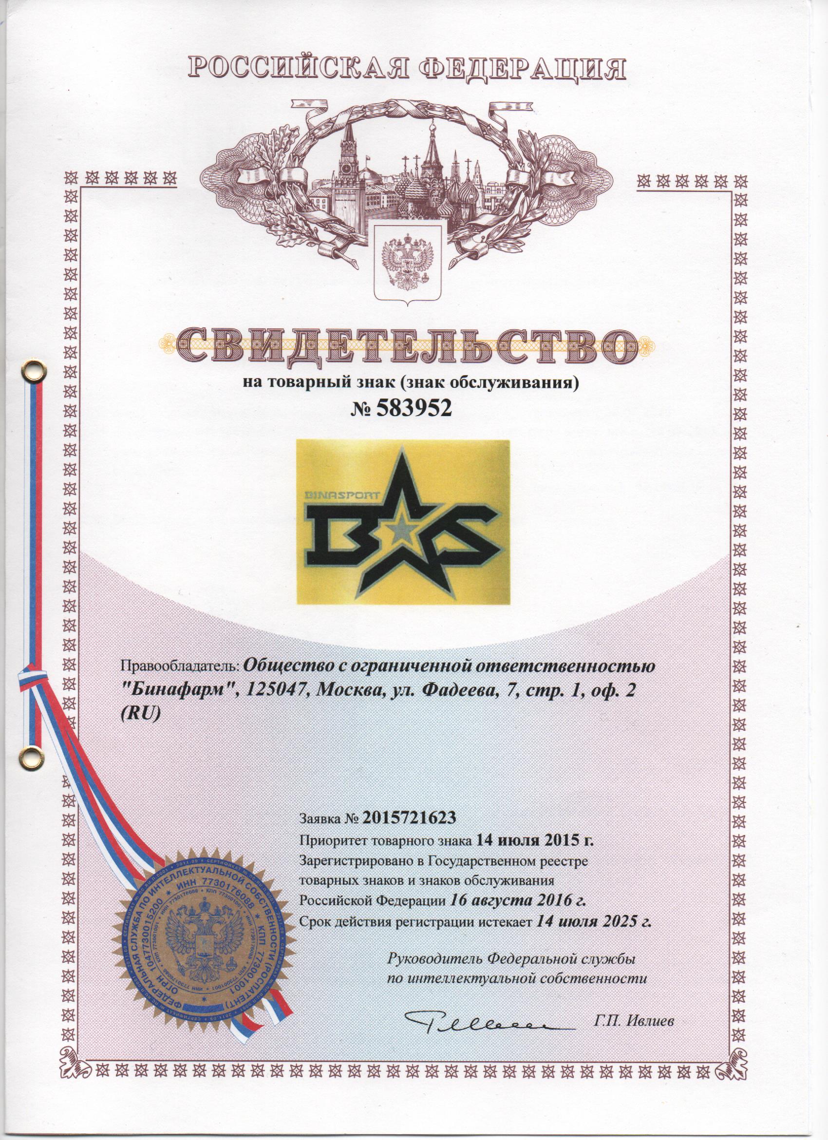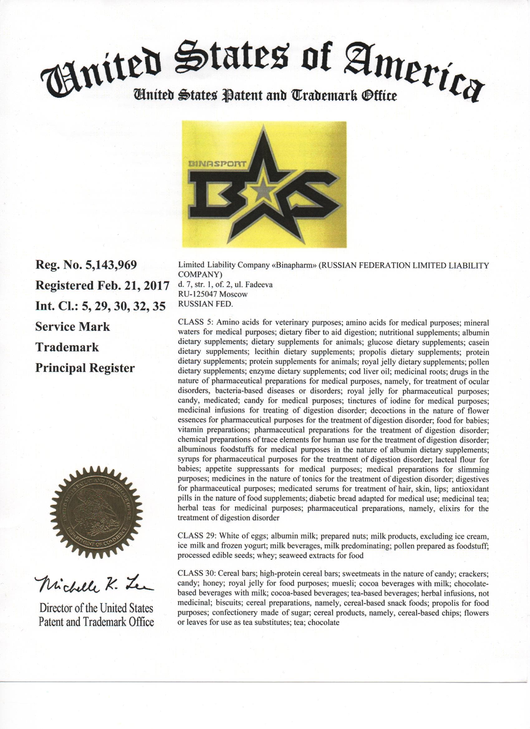 Торговая марка «Binasport» является зарегистрированным товарным знаком на территории Соединенных Штатов Америки, стран Евросоюза, Китая, Турции, Ирана и, конечно же, на территории России. Покупая питание «Binasport», вы получаете продукт высочайшего качества, защищённый международным правом!